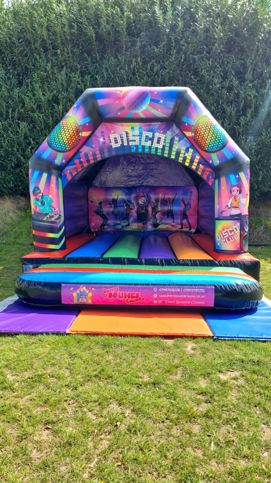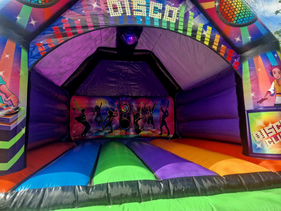 Our Black Disco castle is best paired up with the amazing disco lights and built in speakers for a complete disco fun! The castle is perfect for any disco themed party and also works well for parties without a theme! It will have everyone bouncing around and dancing non stop! Whenever there is a party, then this castle is a must. Featuring an integrated rain/sun cover to keep you dry/protected from the sun. Speaker and Disco Light is optional for an extra charge.