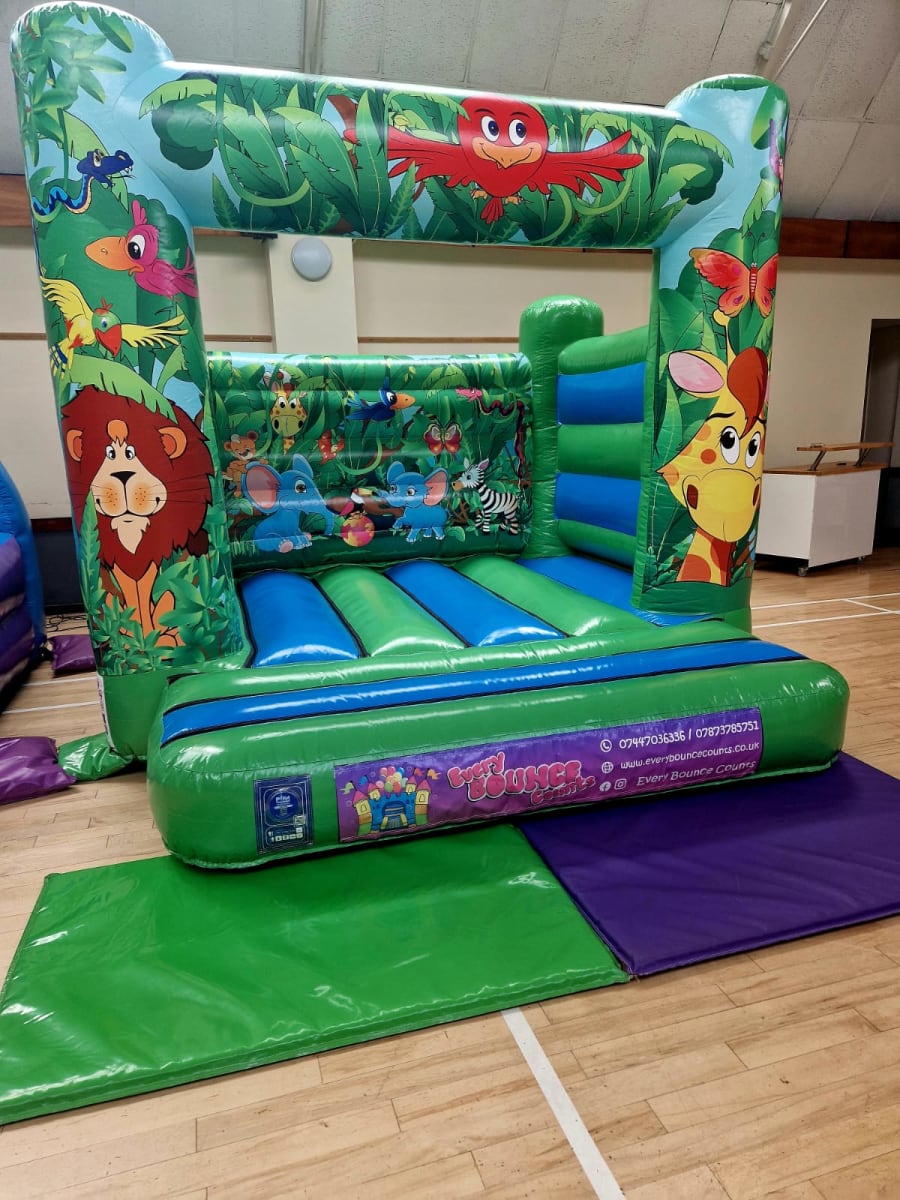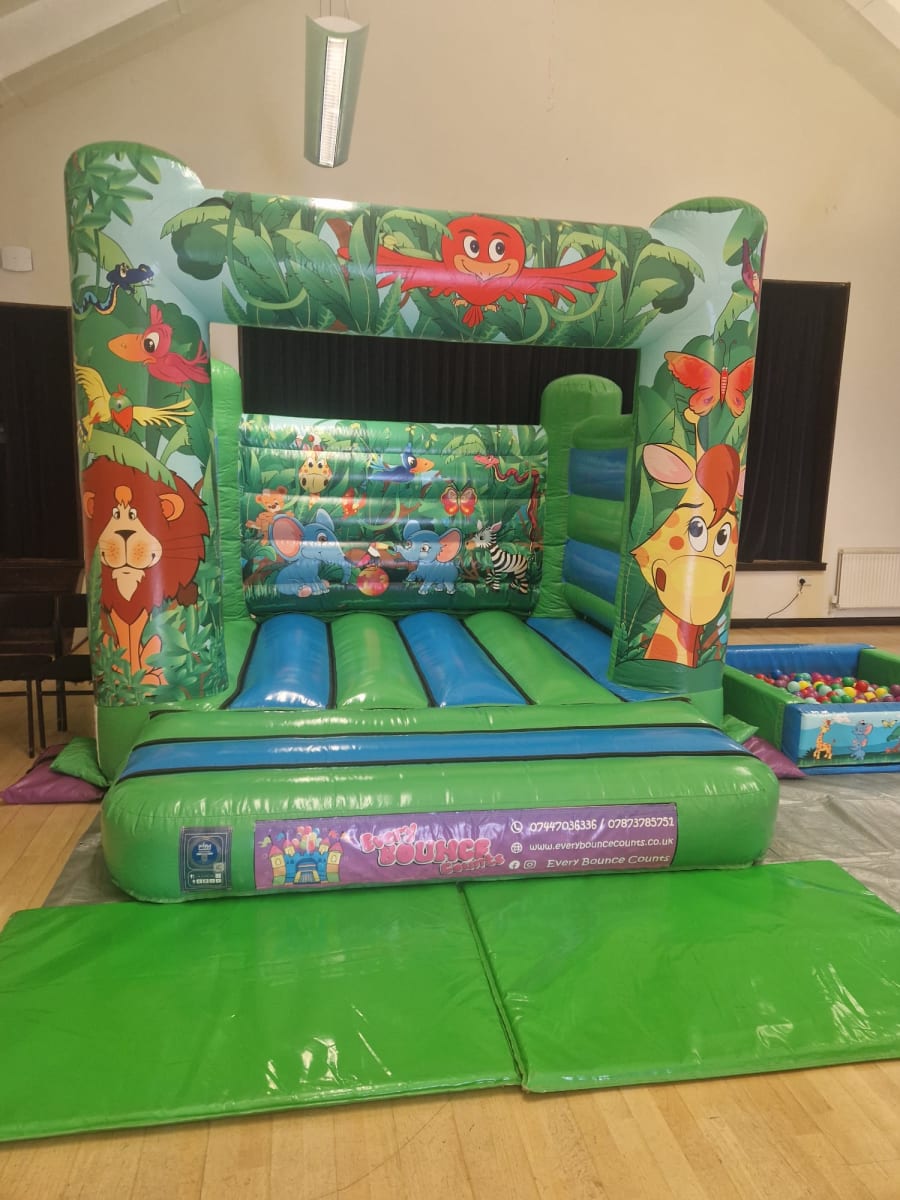 Our baby jungle has cute artwork all over the castle with loads of various animals which catch the eyes of many children. The low height also gives more possibility of fitting in most indoor venues and halls! This can be hired out outdoors as well for the little ones. We also have a matching soft play set which goes perfectly with this castle and gives the smaller kids extra things to do!