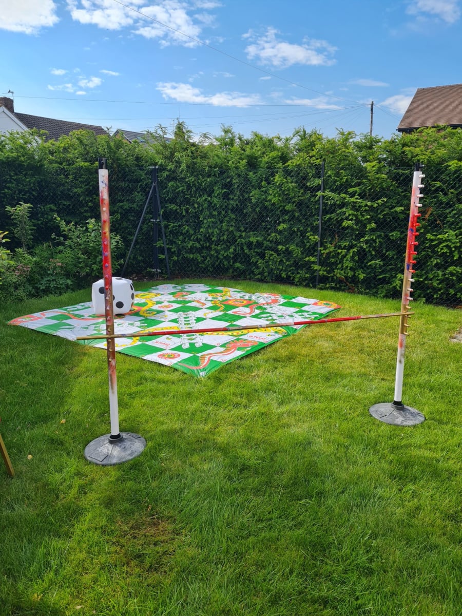 A horizontal bar, known as the limbo bar, is placed on top of two vertical bars.