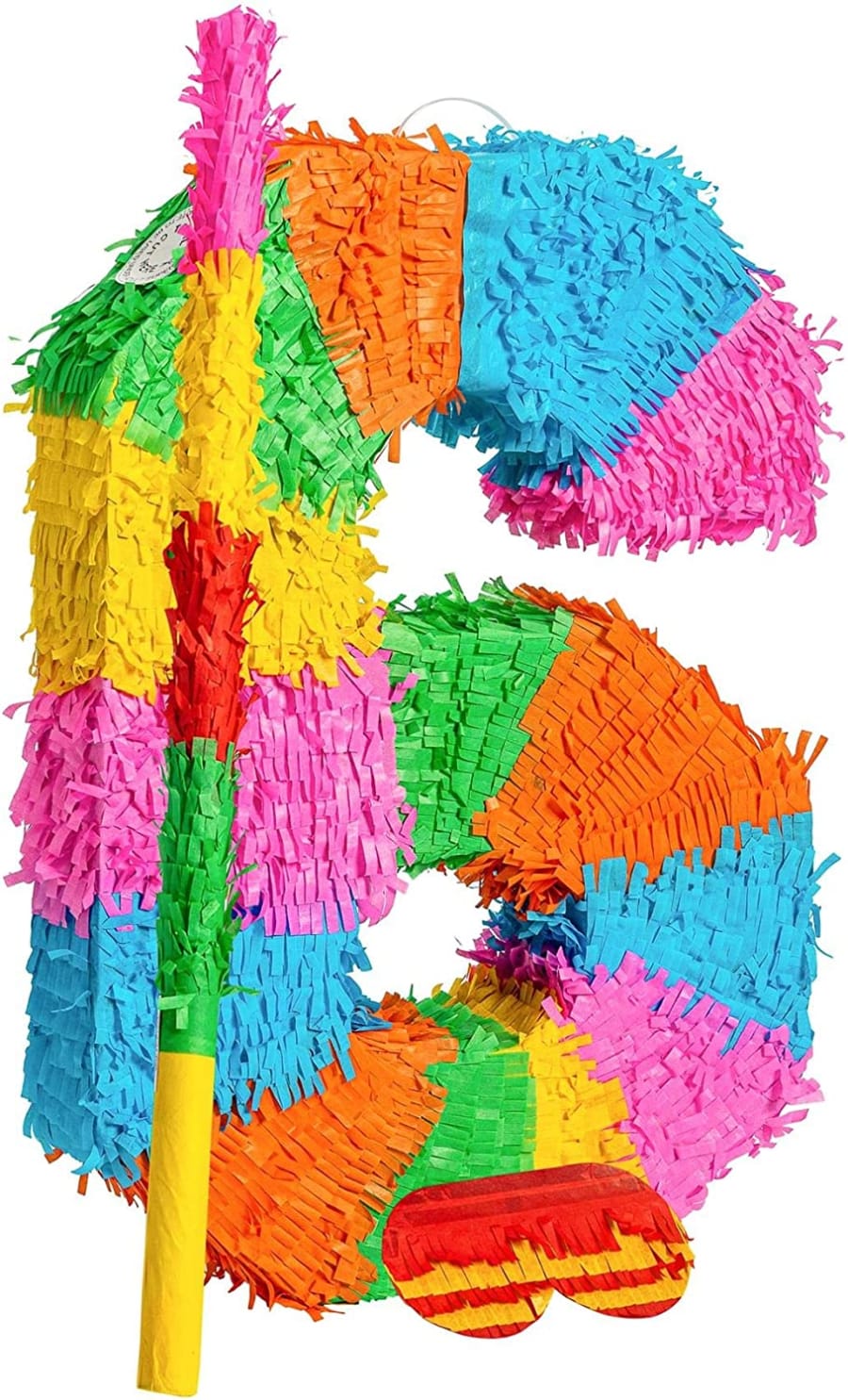 Number 6 Pinata Set with Stick & Blindfold | 35 x 7.5 x 50cm - Green, Red, Yellow.
